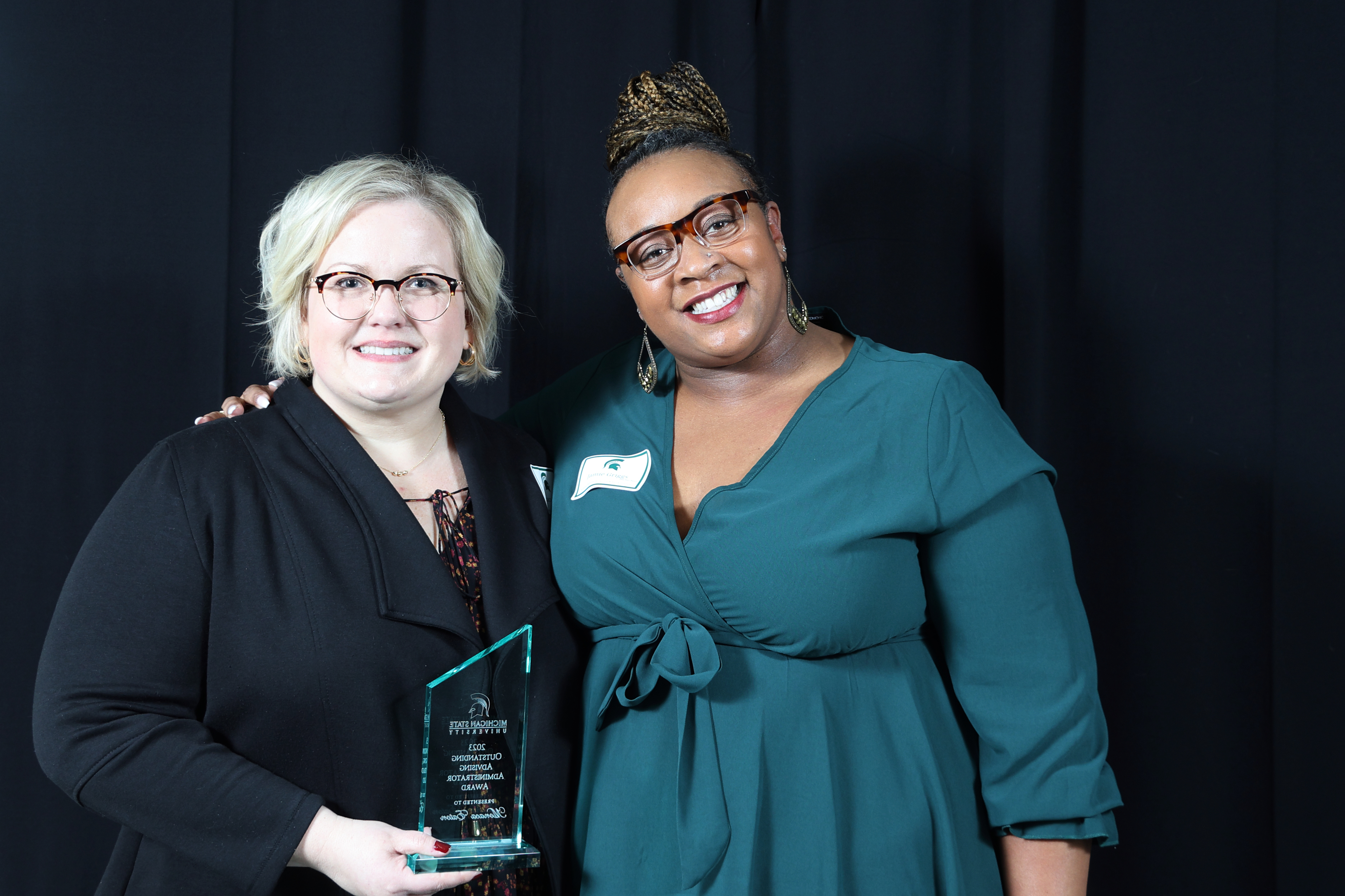 Lindsay Naylor, pictured to the left with one of her nominators, Erica Weeks, received the Outstanding Established Academic Advisor Award, which celebrates an established professional advisor who has contributed to the MSU community for more than three years. Lindsay is from the College of Engineering and was also nominated by Kristina Chan.