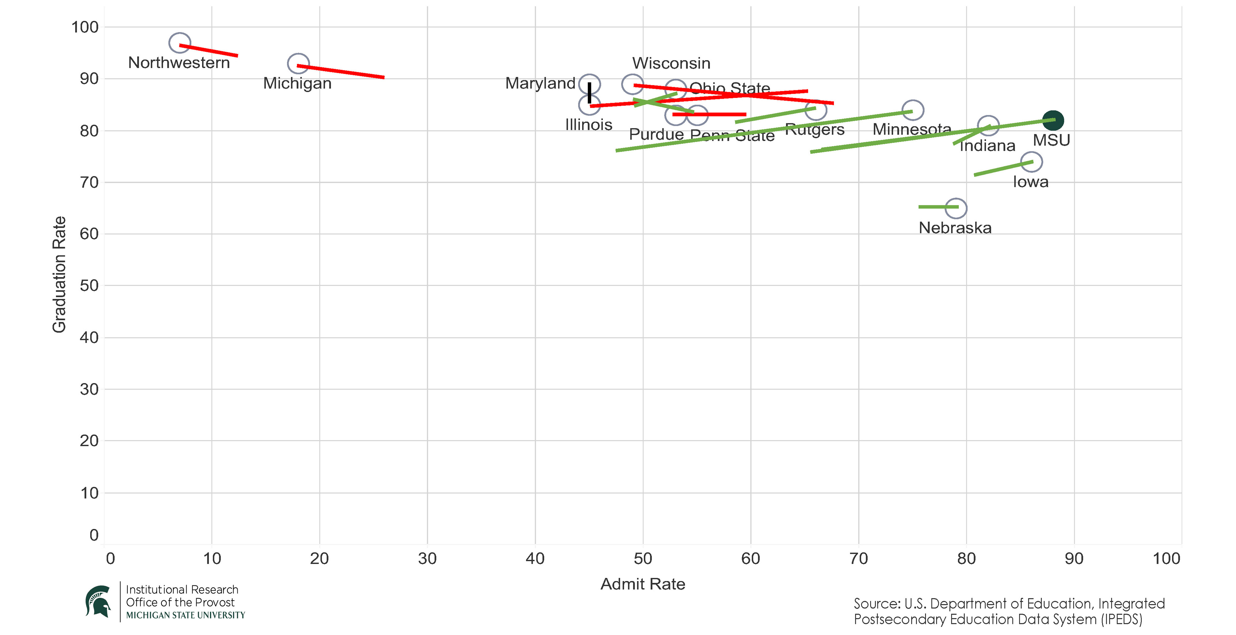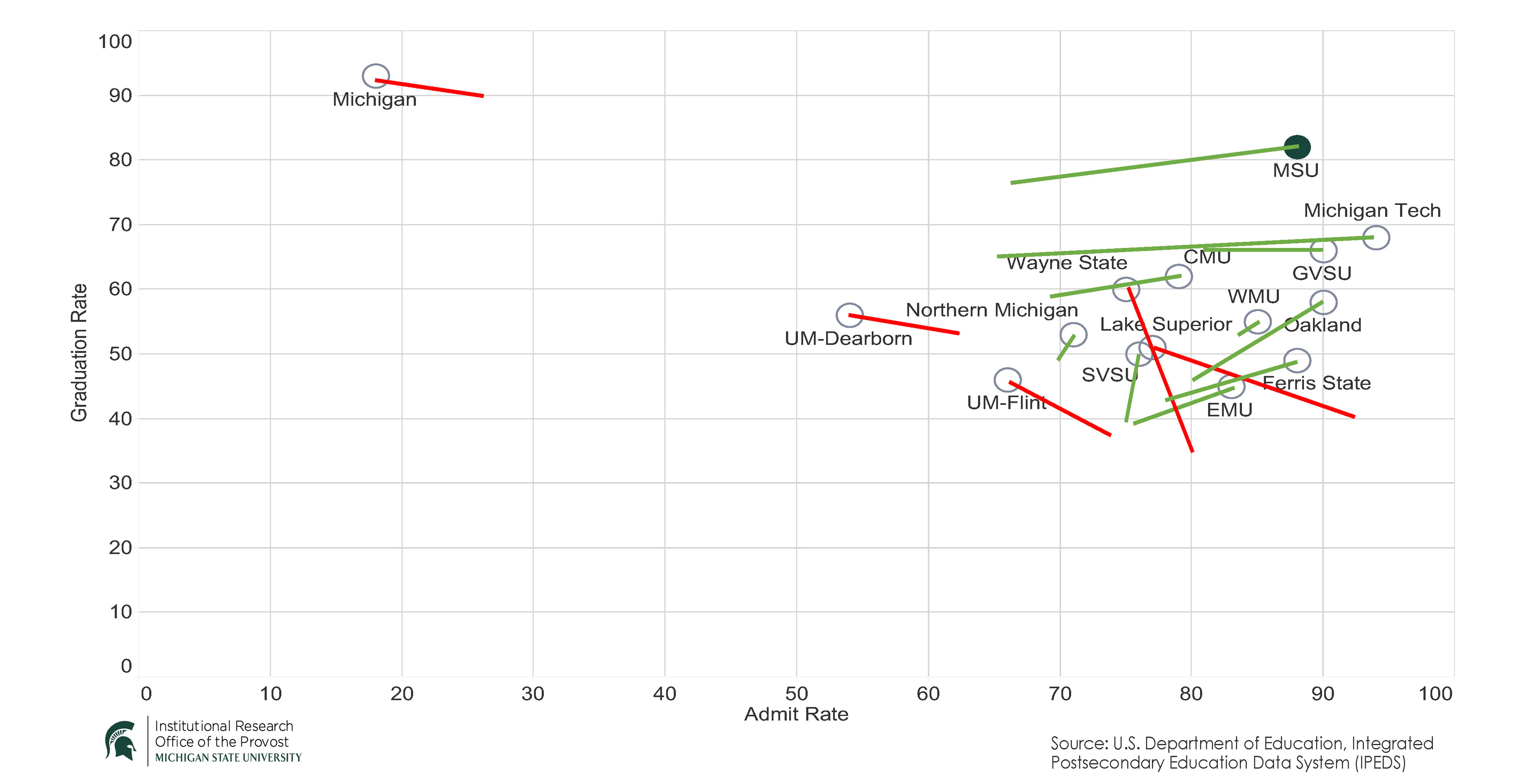Last week, I asked my colleagues in MSU’s Institutional Research to create a scatter plot of Big 10 and Michigan public institutions’ acceptance and graduation rates in 2015 and in 2023.