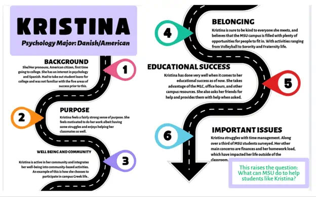 After learning about ethnography, process mapping, design thinking and participatory action research as methods for gathering the experiences of students, the UGS students went out into the MSU community (the MSU Union, Synder-Phillips Hall, and the International Center) to survey students. They asked questions around the five areas of success and engaged passing students to indicate where students felt belonging and community on large maps of the campus. After having engaged close to 100 students, they identified themes across all three activities using those themes to create two student profiles (using whatever creative format worked for them) and presented them to the rest of class as part of their final project.